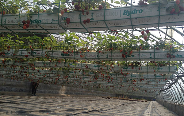 我们随后走访了济南的草莓温室,去的时候已经是4月底,草莓是去年9月种的,到现在已经基本采摘完毕。虽然错过了最佳的时节,但依然能看到草莓生长得不错,没有病害的迹象,还有少量草莓果实可以采摘。